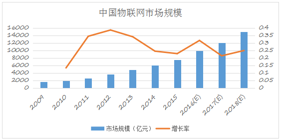 以中國(guó)為例, 2015年中國(guó)物聯(lián)網(wǎng)市場(chǎng)規(guī)模約為7500億,2018年預(yù)計(jì)可以突破15000億,未來(lái)三年,中國(guó)物聯(lián)網(wǎng)市場(chǎng)復(fù)合年增長(zhǎng)率達(dá)25%。