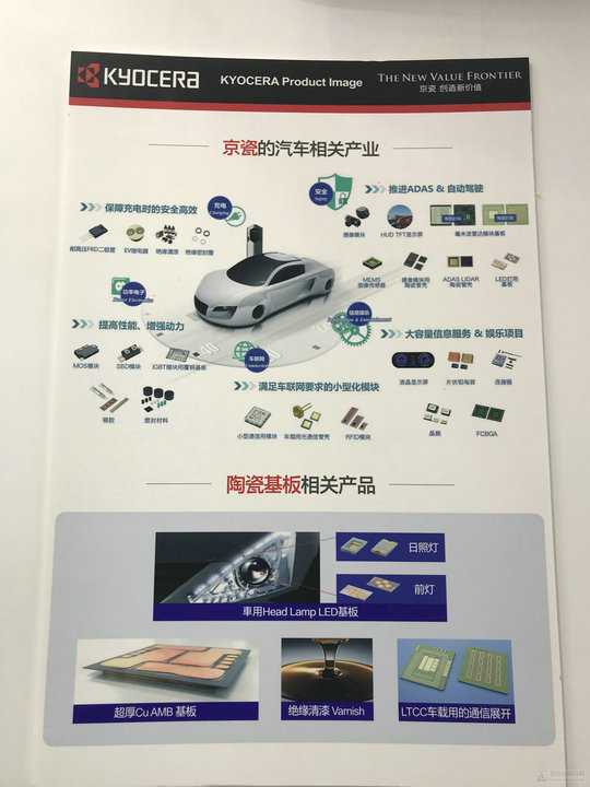 京瓷團(tuán)隊(duì)表示目前公司正提高和加強(qiáng)其它產(chǎn)業(yè)上的應(yīng)用,特別提到了汽車相關(guān)產(chǎn)業(yè),為提供保障充電時(shí)的安全高效,提高性能和增強(qiáng)動(dòng)力,滿足車聯(lián)網(wǎng)要求的小型化模塊,推動(dòng)ADAS&自動(dòng)駕駛,大容量信息服務(wù)&娛樂(lè)項(xiàng)目,目前已擁有整套零部件解決方案。