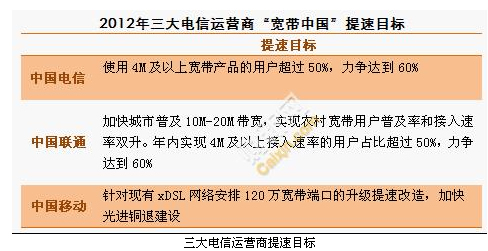基于工信部對(duì)于“寬帶中國(guó)”2012年工作目標(biāo),日前三大電信運(yùn)營(yíng)商同期公布了各自的2012計(jì)劃。