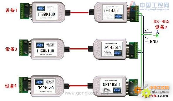 典型應用2:圖2為多臺串口設(shè)備通過多對OPT485L1進行開叉的光纖組網(wǎng)通信的典型應用。最遠兩端的串口設(shè)備為RS-232、RS-485或RS-422,中間的設(shè)備2為RS-485口。將中間的3個OPT485L1的A-A相連、B-B相連、再一起接到設(shè)備2的RS-485口上。這樣實現(xiàn)了多臺串口設(shè)備的開叉的光纖組網(wǎng)通信,多機通信軟件同RS-485電纜線組網(wǎng)。在這個光纖網(wǎng)中,任何一個設(shè)備作為主機時,網(wǎng)絡(luò)都是可行的。如果設(shè)備2為RS-232口,可以加RS-232/RS-485轉(zhuǎn)換器,波仕也有RS-422/RS-485轉(zhuǎn)換器。圖2中的任何設(shè)備還可以繼續(xù)以RS-485方式繼續(xù)級聯(lián)或繼續(xù)開叉。