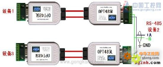 典型應用1:在圖1中,串口設(shè)備1與串口設(shè)備3都配有RS-232、RS-485或者RS-422接口,串口設(shè)備2配有RS-485口。通過兩對OPT485L光纖轉(zhuǎn)換器、可實現(xiàn)3臺設(shè)備的光纖組網(wǎng)通信。如果設(shè)備2配的是RS-232口,只要加一個RS-232/RS-485轉(zhuǎn)換器即可。