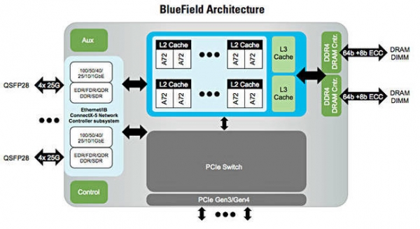 Mellanox公司指出:"BlueField系統(tǒng)芯片家族通過連續(xù)網(wǎng)狀網(wǎng)絡(luò)、DDR4內(nèi)存控制器、多個(gè)支持10/25/40/50/100 Gbit每秒的以太網(wǎng)/InfiniBand端口以及一套具備多端口且支持EP SR-IOV與RC功能的PCIe Gen 3.0/4.0集成化PCIe交換機(jī)共同實(shí)現(xiàn)了一組64位ARMv8 A72計(jì)算核心的彼此互連。該系統(tǒng)芯片主要面向那些將數(shù)據(jù)層與控制層服務(wù)相結(jié)合以實(shí)現(xiàn)存儲與網(wǎng)絡(luò)功能的I/O敏感型與計(jì)算敏感型應(yīng)用。"
