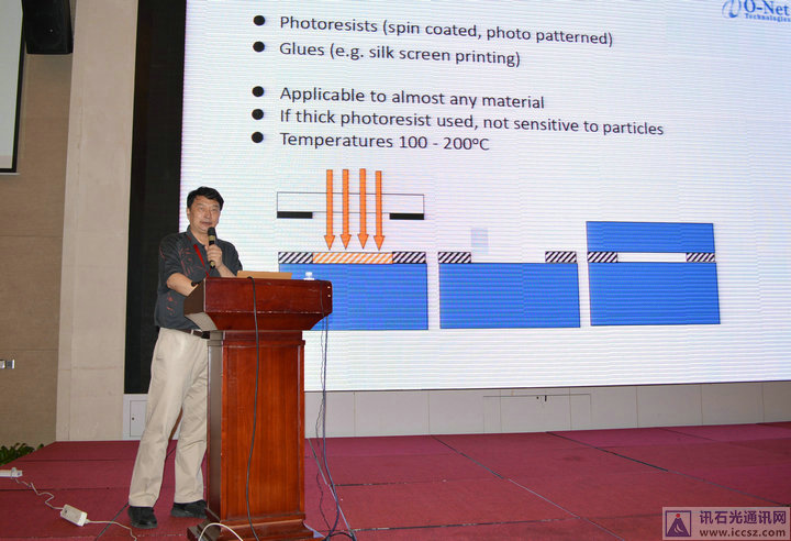 在有關(guān)光通信芯片發(fā)展的演講之后是《光器件封裝發(fā)展趨勢(shì)》主題演講,演講者是昂納光通信全球市場(chǎng)推廣副總裁華一敏博士。華博士負(fù)責(zé)監(jiān)管本集團(tuán)光網(wǎng)絡(luò)部之無(wú)源光器件、模塊、子系統(tǒng)及放大器,以及自動(dòng)化及傳感部之激光雷達(dá)(LiDAR)的產(chǎn)品營(yíng)銷(xiāo)和產(chǎn)品管理,擁有二十幾年行業(yè)經(jīng)驗(yàn)。華博士提到“為什么要探索晶片鍵合過(guò)程?”我們的目標(biāo)是將芯片級(jí)封裝推向圓片級(jí),第一是減少功能設(shè)備的空間和成本;第二是提高功能器件的可靠性和成本;第三是構(gòu)建新型功能器件。隨后,華博士在演講主要為我們講到晶片鍵合技術(shù)、晶圓鍵合技術(shù)的比較和芯片級(jí)封裝是目標(biāo)這幾大部分。