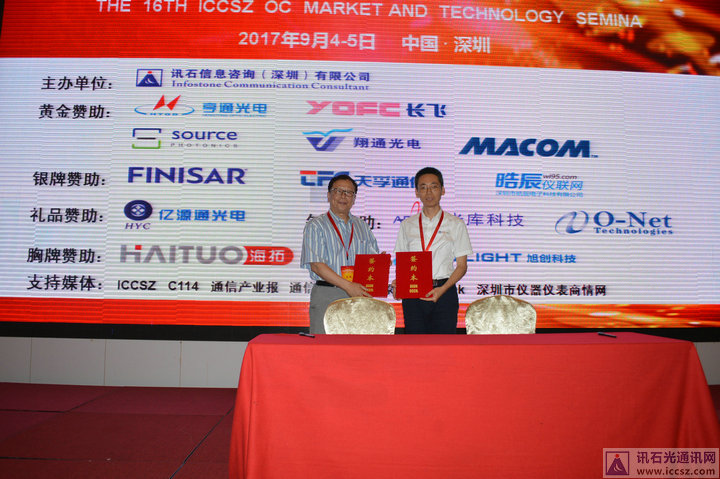在十位嘉賓的精彩演講中,4號(hào)會(huì)議漸漸接近接近尾聲,最后環(huán)節(jié)是訊石與陜西光電子集成電路先導(dǎo)技術(shù)研究所(以下簡(jiǎn)稱(chēng):先導(dǎo)所)的合作簽約儀式。先導(dǎo)所是由中科院西安光機(jī)所聯(lián)合重點(diǎn)高校、科研院所共同發(fā)起的國(guó)內(nèi)首家“產(chǎn)-學(xué)-研-資-用-孵”相結(jié)合的光電子集成產(chǎn)業(yè)孵化公共平臺(tái),為項(xiàng)目提供全生命周期的專(zhuān)業(yè)技術(shù)、知識(shí)、裝備、專(zhuān)項(xiàng)基金、專(zhuān)業(yè)團(tuán)隊(duì)管理和服務(wù)。而訊石是中國(guó)第一家以光通信企業(yè)為對(duì)象的專(zhuān)業(yè)化咨詢(xún)服務(wù)機(jī)構(gòu)。公司自2001年成立以來(lái),為海內(nèi)外眾多光通信行業(yè)提供行業(yè)預(yù)測(cè)、企業(yè)規(guī)劃、市場(chǎng)信息等前瞻性服務(wù)公司現(xiàn)已成為國(guó)際化的光通信顧問(wèn)咨詢(xún)權(quán)威機(jī)構(gòu)。