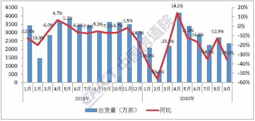 ICC訊 根據(jù)中國信通院發(fā)布數(shù)據(jù)顯示,2020年9月,國內(nèi)手機市場總體出貨量2333.4萬部,同比下降35.6%;1-9月,國內(nèi)手機市場總體出貨量累計2.26億部,同比下降21.5%。