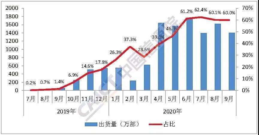 2020年9月,國內(nèi)市場5G手機出貨量1399.0萬部,占同期手機出貨量的60.0%;上市新機型26款,占同期手機上市新機型數(shù)量的44.8%。1-9月,國內(nèi)市場5G手機累計出貨量1.08億部、上市新機型累計167款,占比分別為47.7%和46.5%。