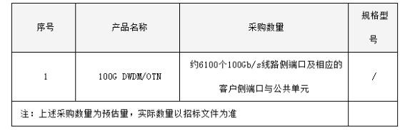 據(jù)此前報(bào)道,該采購(gòu)項(xiàng)目于今年三月份獲得審批,采購(gòu)數(shù)量約為6100個(gè)100Gb/s線路側(cè)端口及相應(yīng)的客戶側(cè)端口與公共單元,實(shí)際以招標(biāo)量為準(zhǔn)。