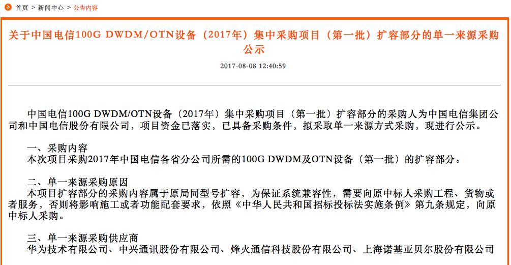 中國(guó)電信擬采用單一來源供應(yīng)商,從華為技術(shù)有限公司、中興通訊股份有限公司、烽火通信科技股份有限公司、上海諾基亞貝爾股份有限公司四家公司采購(gòu)。