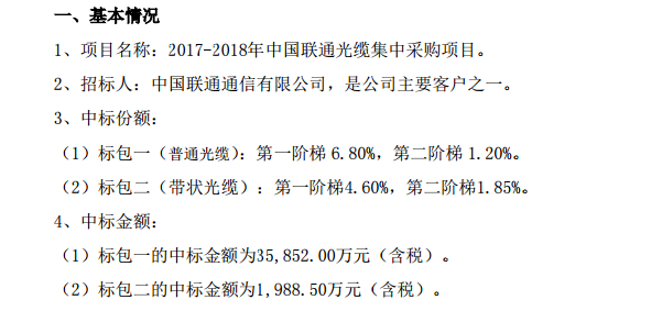 通鼎互聯(lián)中標(biāo)的是2017-2018年中國聯(lián)通光纜采購項目,該項目采購普通光纜和帶狀光纜,總采購規(guī)模約為5830萬芯公里,其中第一階梯采購規(guī)模約為4296萬芯公里,第二階梯采購規(guī)模約為1534萬芯公里,限價62元/芯公里??偨痤~不超過36.15億元。