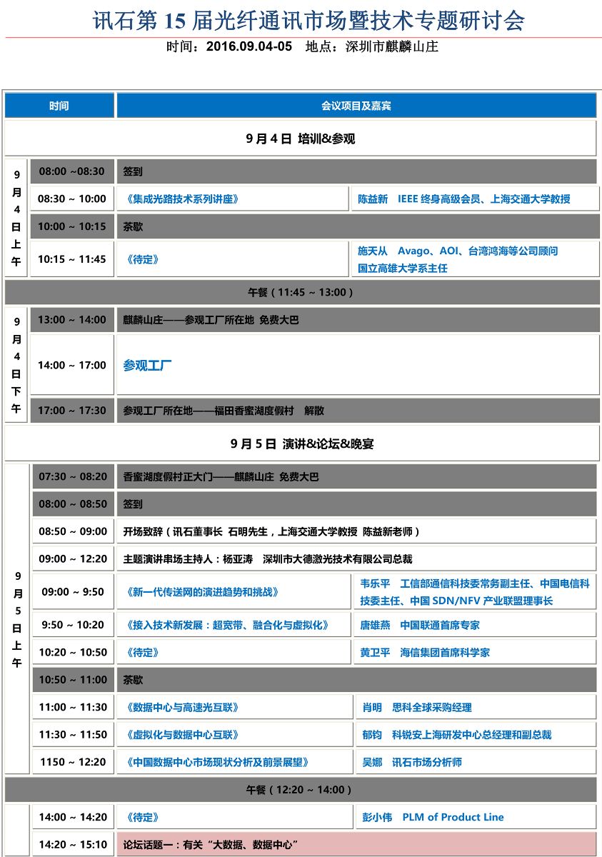 2016年第十五屆訊石研討會預計規(guī)模350人,創(chuàng)歷史之最。研討會主題為《通信大趨勢與技術發(fā)展論談》,講師團隊將以國內知名市場分析師、行業(yè)知名意見領袖、各光通訊協(xié)會的代表以及光通訊產業(yè)鏈大企業(yè)高管組成,學術嚴肅與自由活躍相結合,話題與演講圍繞數(shù)據(jù)中心、SDN/NFV、硅光子、千兆寬帶、400G等通信熱點,聆聽演講與參與討論相連貫,傾聽行業(yè)領袖的聲音,助您精確地把握時代發(fā)展的脈搏。