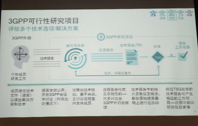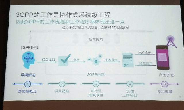 來自于3GPP的外部的企業(yè)向3GPP提供概念提案要經(jīng)過批準(zhǔn)階段然后是技術(shù)報(bào)告階段,最后進(jìn)入產(chǎn)品研發(fā)階段。有時(shí),3GPP會(huì)提出修改請求。也就是說要經(jīng)歷五個(gè)階段:從愿景和概念到項(xiàng)目提案再到可行性研究項(xiàng)目、開發(fā)工作項(xiàng)目最后到商用部署階段。