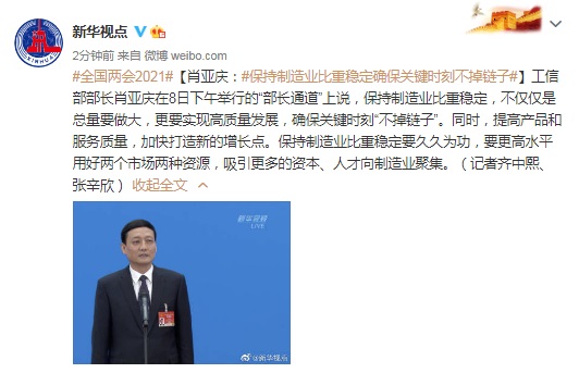 工信部部長肖亞慶在回答新華社時表示:要實現(xiàn)制造業(yè)實現(xiàn)高質(zhì)量發(fā)展,一方面需是完善產(chǎn)業(yè)鏈,補短板,使得任何時候制造業(yè)都是經(jīng)濟支撐;二是在智能化、綠色化、高地化進一步提升,使得我們的制造業(yè)水平在原有基礎(chǔ)上進一步提升。
