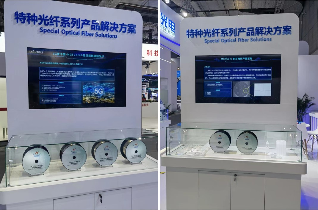 亨通光電本次展出的特種光纖產(chǎn)品主要包括超低損耗大有效面積G.654E光纖、海洋光纖、數(shù)據(jù)中心領(lǐng)域應(yīng)用的OM4、OM5系列多模光纖,以及面向空分復(fù)用的多芯光纖等系列產(chǎn)品。在光纖激光器應(yīng)用領(lǐng)域,展出了有源光纖和無源光纖,以穩(wěn)定的高能量傳輸助力智能先進(jìn)制造。此外,本屆展會(huì)亨通光電還展示了高純石英產(chǎn)品,獲得行業(yè)高度關(guān)注。