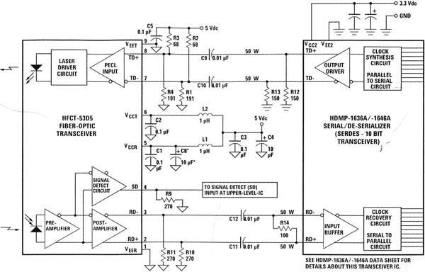 在接收器部分,前置放大器與后置放大器之間是交流耦合的,而后置放大器輸出的實(shí)際數(shù)據(jù)是直流耦合至各自的輸出引腳。信號(hào)檢測(cè)輸出是單端、+5V PECL信號(hào),也是直流耦合至它的輸出引腳。當(dāng)然,在收發(fā)器與支持的物理層集成電路之間應(yīng)設(shè)置正確的互連電路,圖1是推薦的接口電路。