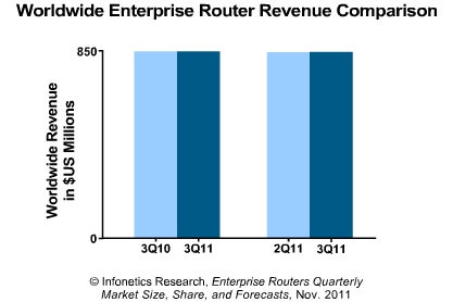 企業(yè)路由器市場(chǎng),3Q11市場(chǎng)份額為74.2%,其次是惠普和Juniper;跟去年同期相比,
