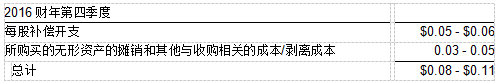 思科估計(jì),在2016財(cái)年第四季度,其GAAP 每股收益預(yù)計(jì)為0.48美元至0.53美元,比非GAAP每股收益低0.08美元至0.11美元,具體情況如下: