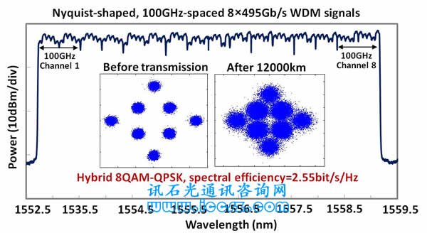在該系統(tǒng)中,可調(diào)頻譜效率的Nyquist形400Gb/s信號是使用調(diào)制子載波產(chǎn)生的。8路100GHz間隔400Gb/s WDM信號結(jié)合在一起,并在由100-km光纖長度構(gòu)成的重新循環(huán)傳輸測試平臺上進行傳輸。