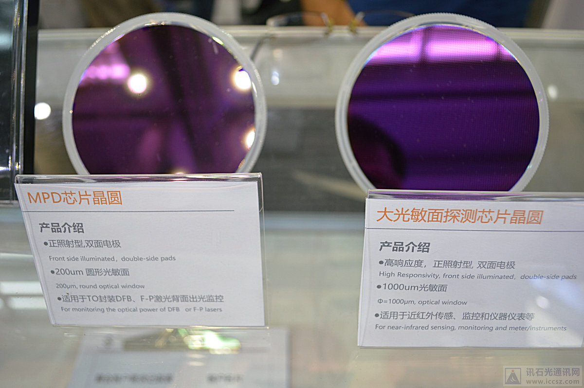 現(xiàn)場展示的晶圓產(chǎn)品,任博士介紹公司主要展出的25G PD和25G PD array,對于未來5G和100G/200G/400G光模塊所需要的芯片產(chǎn)品,公司已經(jīng)做好了準(zhǔn)備,25G產(chǎn)品正在通過國內(nèi)光模塊和光器件大廠的可靠性測試,蘇納光電芯片基本被行業(yè)認(rèn)可。