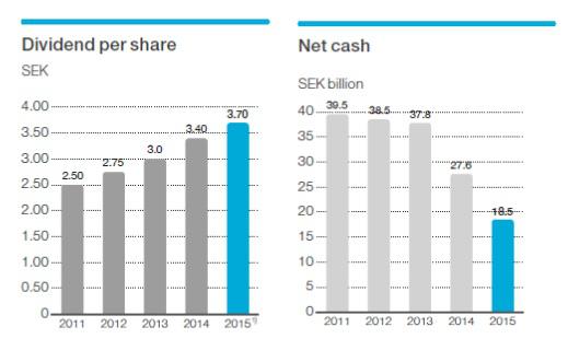 如果說衛(wèi)翰思執(zhí)政愛立信期間有做得讓股東滿意的事,逐年提高的股東分紅無疑是最大的亮點。從2015年財報披露的數(shù)據(jù)來看,從2011年到2015年間愛立信每股現(xiàn)金分紅始終保持著10%左右的增幅,五年間漲幅達(dá)到了48%,更多的現(xiàn)金分紅無疑會受到投資市場的歡迎,這也是愛立信在股票市場上股價表現(xiàn)較為穩(wěn)定的原因之一。
