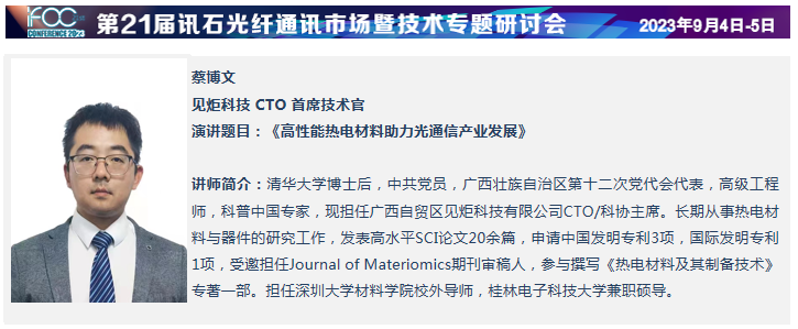 屆時,廣西自貿(mào)區(qū)見炬科技有限公司CTO/首席技術(shù)官 蔡博文 博士將在本屆訊石研討會9月5日的主論壇上發(fā)表主題為《高性能熱電材料助力光通信產(chǎn)業(yè)發(fā)展》的演講。見炬科技聚焦通信領(lǐng)域全場景溫控技術(shù)。見炬科技由院士牽頭,匯聚國內(nèi)頂尖的熱管理領(lǐng)域科學家、產(chǎn)業(yè)精英,從基礎(chǔ)研發(fā)、精益生產(chǎn)、關(guān)鍵工藝、品質(zhì)控制到市場開發(fā)形成產(chǎn)學研體系。研發(fā)的高性能納米晶熱電材料和高維散熱技術(shù),開發(fā)出超微型熱電半導體致冷器(Micro TEC)、微型熱電半導體致冷器(Mini TEC)和高維散熱系統(tǒng),為通信光模塊、紅外激光器件的精準溫控,以及為4G/5G通信機房式基站、機柜式基站,大數(shù)據(jù)中心,儲能電站的溫控節(jié)能,提供技術(shù)解決方案及高品質(zhì)產(chǎn)品。。