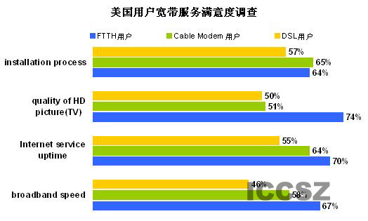 FTTH用戶對(duì)他們的因特網(wǎng)服務(wù)正常運(yùn)行時(shí)間感到滿意,Cable Modem為64%,DSL用戶為55%。