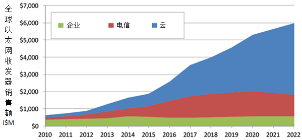 圖2. 全球以太網(wǎng)收發(fā)器銷售額分布($M) 來源:LightCounting