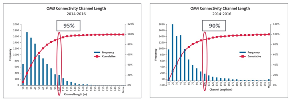 圖3. 數(shù)據(jù)中心以太網(wǎng)OM3/4連接通道長(zhǎng)度分布