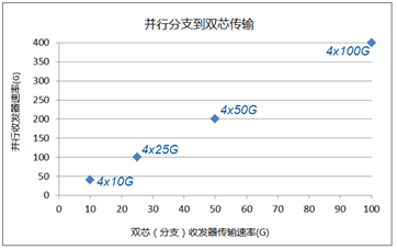 常規(guī)的帶有QSFP收發(fā)器端口的40G交換機(jī)板卡可以提供36個(gè)40G端口。如果我們使用端口分支的方式將一個(gè)40G端口分支為4個(gè)10G端口,則36個(gè)40G端口可以支持4×36=144個(gè)10G鏈路。比較而言,常規(guī)的帶有SFP+收發(fā)器端口的10G交換機(jī)板卡可以提供48個(gè)10G端口。如果需要達(dá)到同樣的10G端口數(shù),則需要部署3個(gè)48口10G交換機(jī)。目前全球已出貨的40G QSFP交換機(jī)大概有一半應(yīng)用于10G端口分支。采用這種方式不但可以提高10G端口密度3倍左右,而且每個(gè)10G端口能耗可以降低60%,成本可以降低30%-45%。而且當(dāng)數(shù)據(jù)中心未來需要升級(jí)為全40G網(wǎng)絡(luò)時(shí),無需重新購(gòu)買40G收發(fā)器和交換機(jī)就可以平滑升級(jí)。同樣的方式也適用于100G乃至未來的200G/400G網(wǎng)絡(luò)(如圖4所示)。因此,在可以預(yù)見的未來,并行傳輸方式仍將被大多數(shù)高密度數(shù)據(jù)中心所采用。