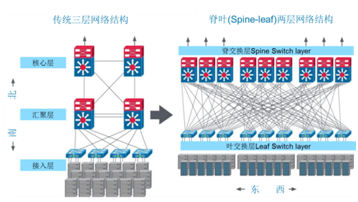圖5.傳統(tǒng)三層網(wǎng)絡(luò)結(jié)構(gòu)與脊葉(Spine-leaf)兩層網(wǎng)絡(luò)結(jié)構(gòu)的對(duì)比