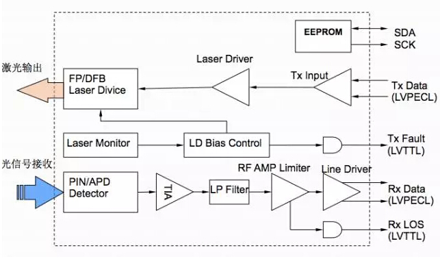 光收發(fā)一體模塊是光通信的核心器件,完成對光信號的光-電/電-光轉(zhuǎn)換。由兩部分組成:接收部分和發(fā)射部分。接收部分實(shí)現(xiàn)光-電變換,發(fā)射部分實(shí)現(xiàn)電-光變換。