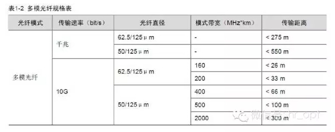 多模光纖(MMF,Multi Mode Fiber),纖芯較粗,可傳多種模式的光。但其模間色散較大,且隨傳輸距離的增加模間色散情況會逐漸加重。多模光纖的傳輸距離還與其傳輸速率、芯徑、模式帶寬有關(guān),具體關(guān)系請參見下表。