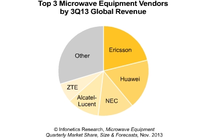 *2013年三季度,全球微波設備市場總額達到11.6億美元,比上一季度增長2%,但與去年同期相比下降7%;