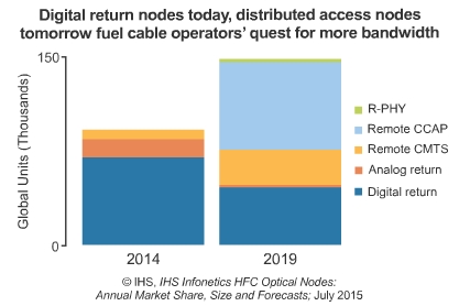 3. 到2019年,IHS預(yù)測所有新的物理節(jié)點(diǎn)中,35%為遠(yuǎn)程CCAP設(shè)備、27%為R-PHY單元、23%為傳統(tǒng)數(shù)字Return節(jié)點(diǎn)。