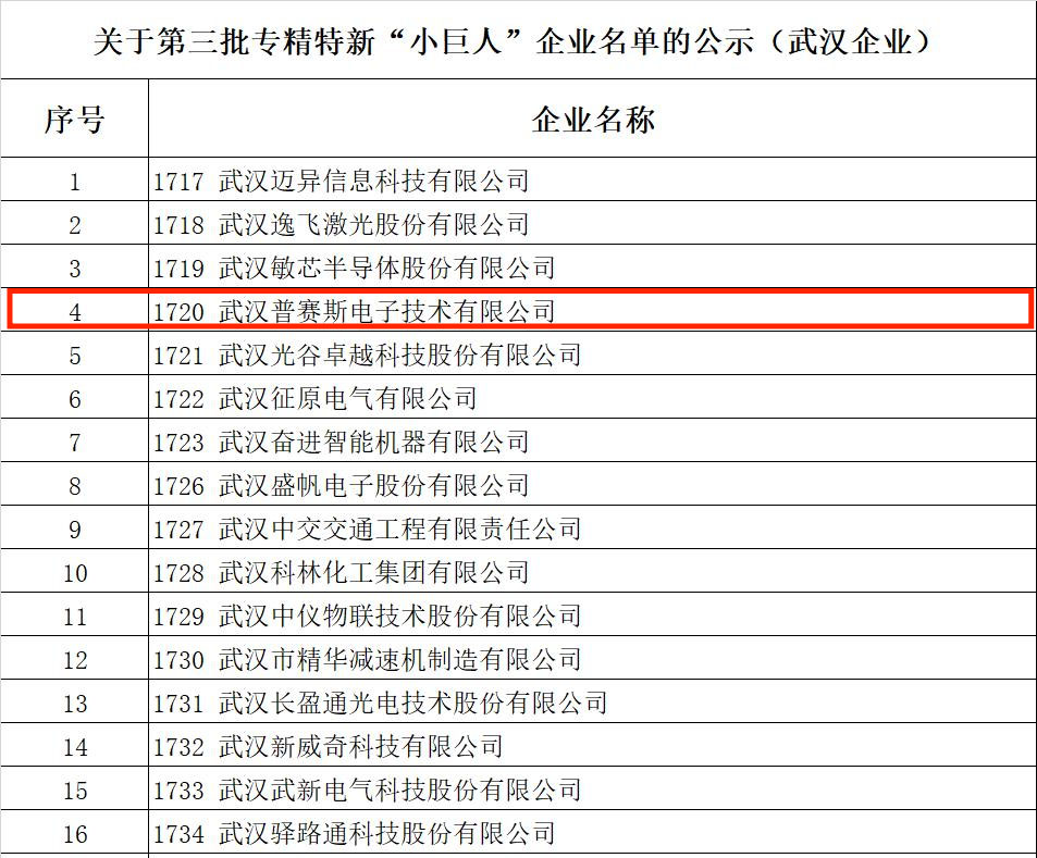 本次公布的第三批專精特新“小巨人”企業(yè)公示名單中全國入選企業(yè)2930家,湖北入選121家企業(yè),其中武漢入選38家,武漢普賽斯電子技術有限公司憑借在光通訊設備行業(yè)中優(yōu)秀的創(chuàng)新實力成功入選。