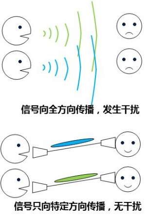 很顯然,在這種情況下會(huì)發(fā)生互相干擾。這是因?yàn)樾盘?hào)會(huì)向著四面八方傳播,所以一個(gè)人會(huì)聽(tīng)到多個(gè)人說(shuō)話的聲音從而無(wú)法有效通訊。但是,如果我們讓每個(gè)說(shuō)話的人都用傳聲筒,讓聲音只在特定方向傳播,這樣便不會(huì)互相干擾了。