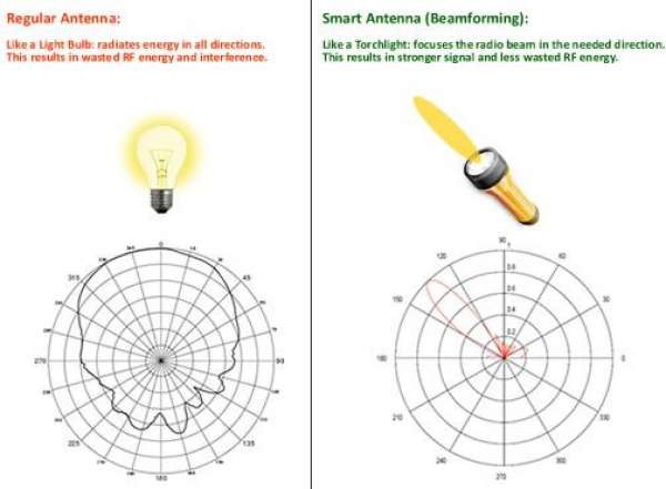 普通天線(方向性弱)和智能天線陣列(方向性強(qiáng))