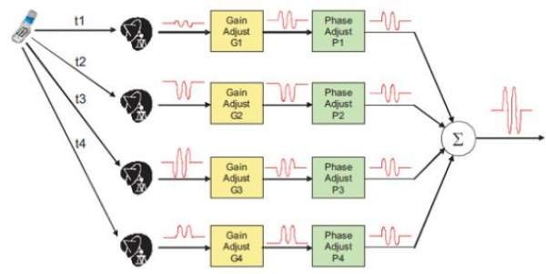 然而,此類天線往往體積較大,很難安裝到移動(dòng)終端上(想象一下iPhone上安了一個(gè)鍋蓋天線會(huì)是什么樣子)。另外,波束成形需要可以隨著接收端和發(fā)射端之間的相對(duì)位置而改變波束的方向。傳統(tǒng)使用單一天線形成波束的方法需要轉(zhuǎn)動(dòng)天線才能改變波束的方向,而這在手機(jī)上顯然不可能。因此,實(shí)用的波束成形方案使用的是智能天線陣列。