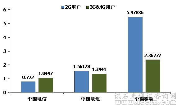 截至2014年4月份三大運(yùn)營商2G、3G&4G用戶數(shù)分布情況(億戶)