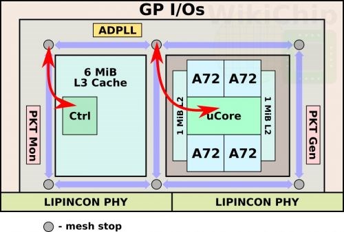 該芯片采用了一種雙芯片設(shè)計(jì),這種技術(shù)可以通過添加額外的PHY來進(jìn)行擴(kuò)展,芯片不同單元間以及不同芯片之間可以形成互聯(lián)。每個(gè)小芯片具有15個(gè)金屬層,模具本身僅為4.4毫米×6.2毫米(27.28mm2)。臺(tái)積電采用了四個(gè)Arm Cortex-A72內(nèi)核,針對(duì)turbo頻率大于4GHz電壓操作,配備了高性能單元(7.5T,3p + 3n)并定制設(shè)計(jì)1級(jí)高速緩存單元,這一模塊有兩個(gè)L2緩存塊,每個(gè)1 MiB,這些是使用它們的高電流位單元實(shí)現(xiàn)的,并以半速運(yùn)行。此外,還有一個(gè)大型的6 MiB L3緩存,使用高密度位單元實(shí)現(xiàn),并以四分之一速度運(yùn)行。