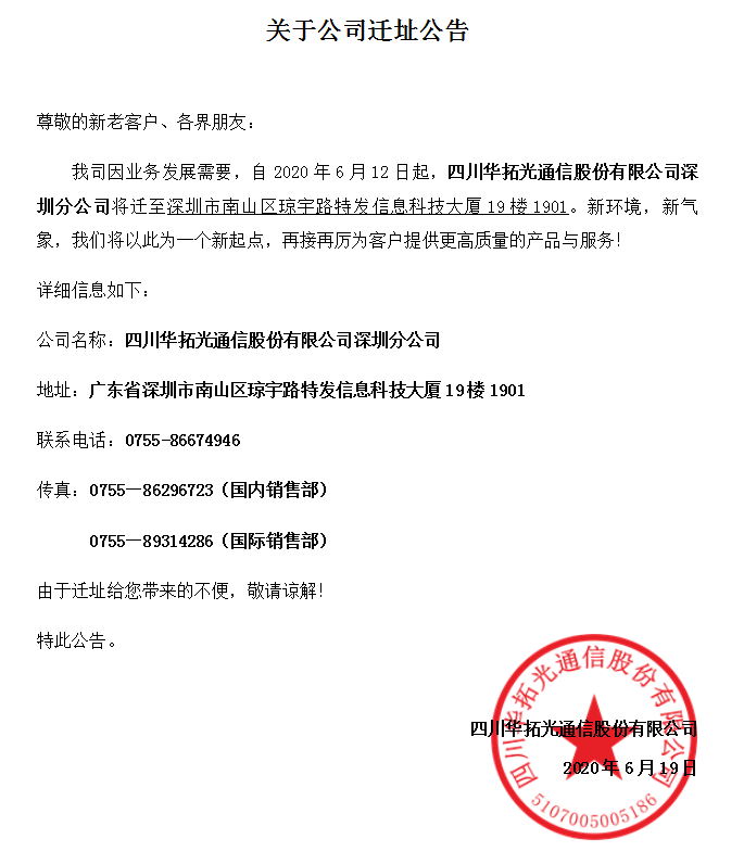 摘要:近日,四川華拓光通信股份有限公司深圳分公司因業(yè)務發(fā)展需要,自2020年6月12日起,遷至深圳市南山區(qū)瓊宇路特發(fā)信息科技大廈19樓1901。