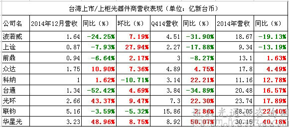 當(dāng)然,除了悲劇還有喜劇。眾達(dá)、光環(huán)、華星光在2014年底的表現(xiàn)相當(dāng)搶眼,12月單月營收、Q414營收、2014全年?duì)I收均上漲!漲幅以光環(huán)、華星光居前。