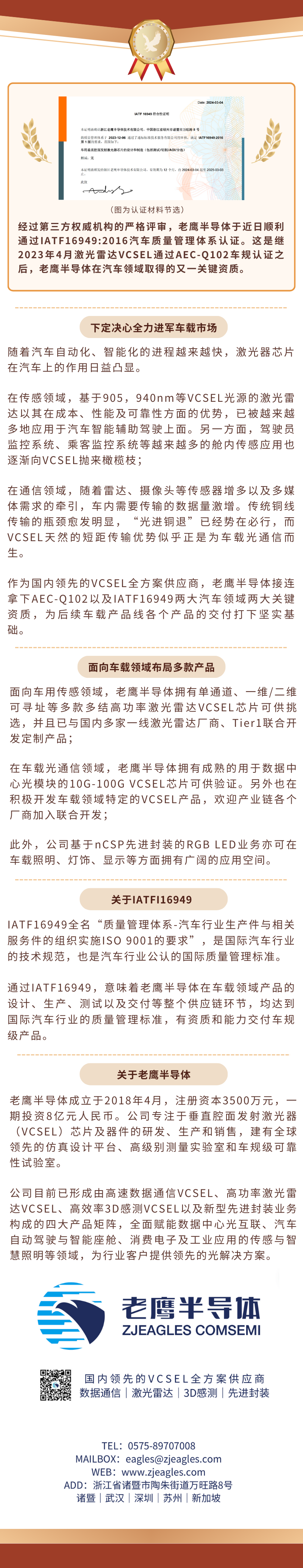 摘要:經(jīng)過(guò)第三方權(quán)威機(jī)構(gòu)的嚴(yán)格評(píng)審,老鷹半導(dǎo)體于近日順利通過(guò)IATF16949:2016汽車質(zhì)量管理體系認(rèn)證。這是繼2023年4月激光雷達(dá)VCSEL通過(guò)AEC-0102車規(guī)認(rèn)證之后,老鷹半導(dǎo)體在汽車領(lǐng)域取得的又一關(guān)鍵資質(zhì)。