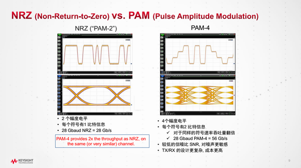 在《100G/400G 數(shù)據(jù)中心解決方案》的演講中,朱老師分享了高速率數(shù)據(jù)中心解決方案的市場(chǎng)趨勢(shì)及100G/400G甚至更高速率的行業(yè)標(biāo)準(zhǔn)的發(fā)展情況,其中100G標(biāo)準(zhǔn)在2015年前基本完成,IEEE 802.3bs 200/400GBaseE 技術(shù)標(biāo)準(zhǔn)在2018年春季發(fā)表。據(jù)悉,是德科技基于PAM4光模塊整體測(cè)試方案包括PAM4信號(hào)產(chǎn)生、光/電PAM4信號(hào)的測(cè)試及系統(tǒng)誤碼率測(cè)試。朱老師闡述PAM4信號(hào)產(chǎn)生和測(cè)試面臨的挑戰(zhàn),將NRZ(“PAM-2”)信號(hào)與PAM-4信號(hào)進(jìn)行對(duì)比,PAM-4比NRZ的噪聲容線更低,更容易受噪聲影響,同時(shí)其對(duì)線性度的要求更高!