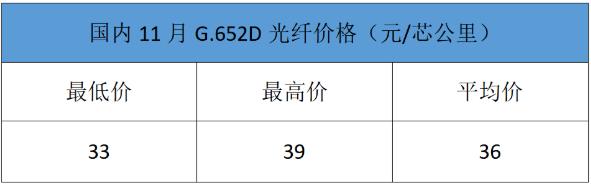 ICC訊 經(jīng)中國(guó)通信企業(yè)協(xié)會(huì)通信電纜光纜專業(yè)委員會(huì)對(duì)會(huì)員單位進(jìn)行相關(guān)調(diào)研,11月,國(guó)內(nèi)G.652D光纖含稅價(jià)格如下: