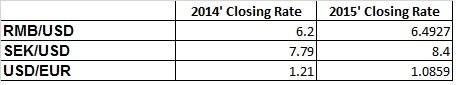解讀之前需要說明的是,五家通信廠商總部分處不同國家,因此財(cái)報(bào)數(shù)據(jù)所用貨幣單位也各不相同:華為和中興采用人民幣,愛立信采用瑞典克朗,諾基亞和阿朗采用歐元。為便于比較,按照各廠家財(cái)報(bào)里使用的如下年終記賬匯率統(tǒng)一折算為第三方貨幣,以美元來核算。但由于2015年美元相對于人民幣、瑞典克朗和歐元的升值幅度不一致,所以幣值的轉(zhuǎn)換會對數(shù)字結(jié)果造成一定的影響,在具體分析中會予以說明: