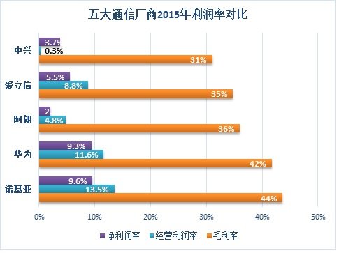 中興掉隊(duì)的風(fēng)險(xiǎn),還體現(xiàn)在五大通信設(shè)備廠商在2015年盈利能力對比之中。