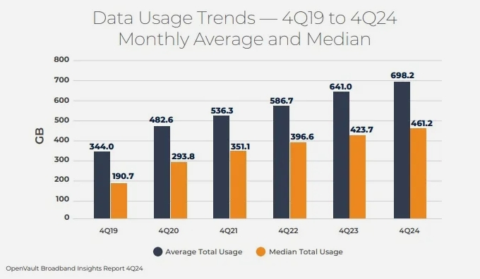 OpenVault表示,2024年第四季度的總體數(shù)據(jù)消耗量為698.2GB,比去年同期的641GB增長了8.9%。中位數(shù)為461.2GB,而去年同期為423.7GB。