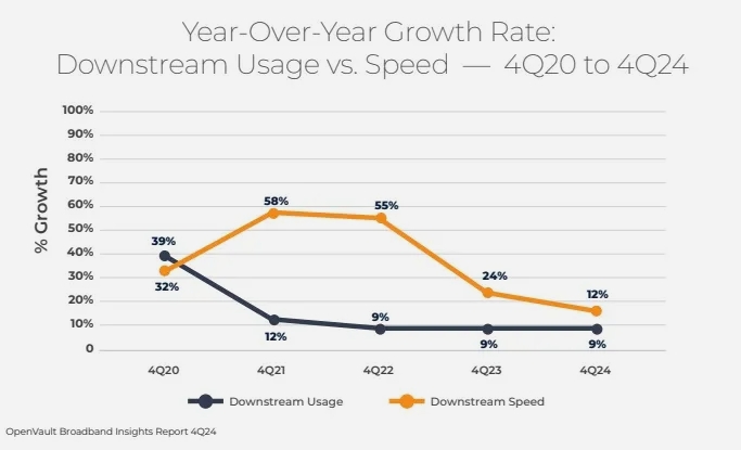 這一下降趨勢發(fā)生在平均下載速度提升12%的背景下,而去年同期的提升幅度為24%。OpenVault觀察到的2024年第四季度平均下游速度增長了11.9%,達到569Mbit/s,而上游速度增長了13.7%,達到32Mbit/s。