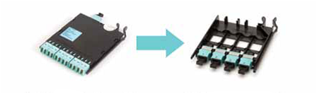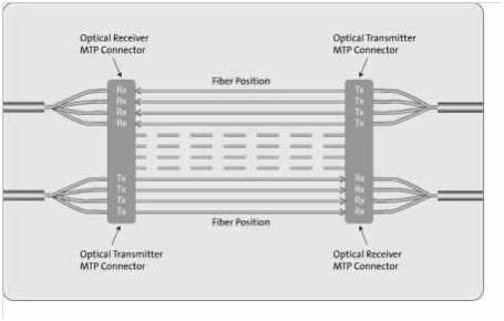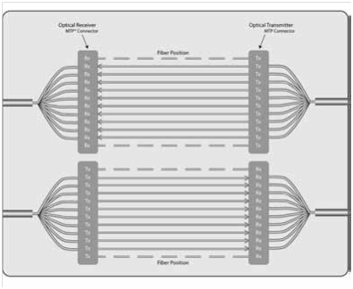 高密度模塊化4U和1U配線架硬件可以容易的支持雙路光纖串行傳輸,使用MPO/LC模塊(圖7)簡化了遷移到并行光學(xué)的路徑。MPO/LC模塊用于扇出主干光纜末端的12芯MPO連接器到單芯或雙芯型連接器。單芯和雙芯跳線可以用于連接到系統(tǒng)設(shè)備端口和交叉連接區(qū)域的配線架。MPO/LC模塊很容易拆除和替換成MPO適配器模塊,根據(jù)需要轉(zhuǎn)換成并行光學(xué)傳輸。40G多模光纖傳輸將使用一個(gè)12芯MPO接頭,100G多模光纖傳輸將使用一個(gè)24芯 MPO連接器連接到收發(fā)器接口。