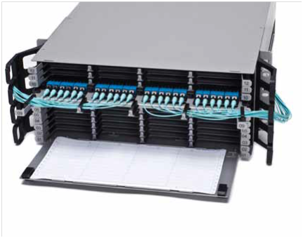 光纖配線架集成的托盤可以容納MPO/LC模塊。每個(gè)托盤都可以安裝四個(gè)獨(dú)立的MPO/LC模塊以提高模塊化,便于移動(dòng),增加和變更。4U和1U配線架分別有12個(gè)和2托盤。4U配線架通常是用于連接到高密度電子設(shè)備以及交叉互聯(lián)使用。1U配線架通常用于主干光纜與架頂式接入交換機(jī)互聯(lián)。圖8和9舉例說明配線架設(shè)計(jì),表3提供了配線架光纖的容量。